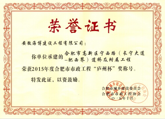 炎炎夏日,驕陽似火,我公司喜獲2015年度合肥市市政工程“廬州杯”獎,給酷熱的盛夏送來了陣陣涼意。由公司承建的合肥市高新區(qū)寧西路(長寧大道-肥西界)道橋及附屬工程經(jīng)合肥市城鄉(xiāng)建設(shè)委員會及合肥市市...