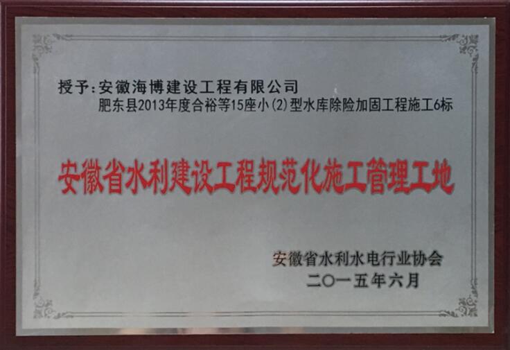 我公司承建的“肥東縣2013年度合裕等15座省級小(二)型水庫除險加固工程6標(biāo)”獲得 2014年度“安徽省水利建設(shè)工程規(guī)范化管理工地”的榮譽稱號。 該工程為省級?。?)型水庫除險加固項...