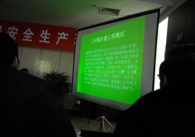 黨組書記張永安同志首先就肥西縣建設(shè)局發(fā)布的 “建設(shè)[2009]151號(hào),建設(shè)[2009]154號(hào),建設(shè)[2009]155號(hào)”文件中的工作進(jìn)行安排。接著解軍培同志講述了“百日會(huì)戰(zhàn)”開展情況,并就安全檢查中存在的隱患以幻燈片的形式展示給參會(huì)企業(yè),讓企業(yè)領(lǐng)導(dǎo)體會(huì)在建項(xiàng)目安全隱患的嚴(yán)重性以及安全隱患處理的緊迫性。李紹敏同志就施工報(bào)建、安全生產(chǎn)、農(nóng)民工工資等問(wèn)題提出存在的問(wèn)題及整改要求,重點(diǎn)對(duì)施工用電、臨邊防護(hù)、腳手架搭設(shè)及地面硬化、施工機(jī)具現(xiàn)場(chǎng)防護(hù)及現(xiàn)場(chǎng)施工人員的安全意識(shí)等方面存在的問(wèn)題進(jìn)行批評(píng)和教育,要求企業(yè)領(lǐng)導(dǎo)一定要在安全生產(chǎn)過(guò)程中起帶頭作用,深入項(xiàng)目施工現(xiàn)場(chǎng),親自把關(guān),把整改措施落實(shí)到位。