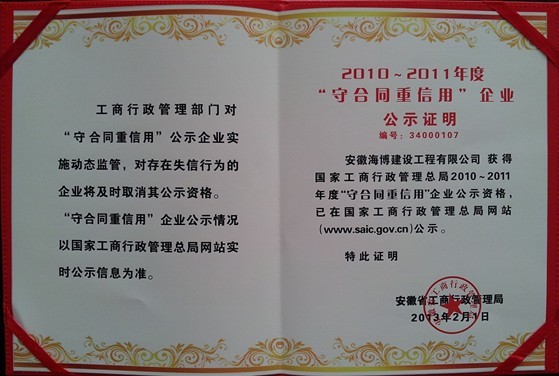 繼2007-2008年度、2009-2010年度連續(xù)兩屆“省級守合同重信用”榮譽(yù)后,在2010-2011年度“守合同重信用”申報評選中,我公司有幸獲得合肥市工商行政管理局和安徽省工商行政管理局的一致認(rèn)可,推選申報“國家級守合同重信用”單位,并順利通過國家工商行政管理總局的審查,喜獲“國家級守合同重信用”殊榮。