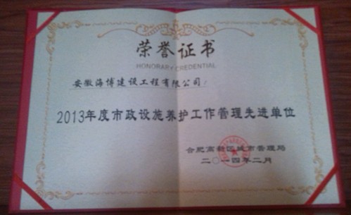 2014年4月,公司承攬的合肥市高新區(qū)市政養(yǎng)護(hù)工程,因表現(xiàn)優(yōu)異,被合肥市高新區(qū)城市管理局授予“2013年度市政設(shè)施養(yǎng)護(hù)工作管理先進(jìn)單位”榮譽(yù)證書。