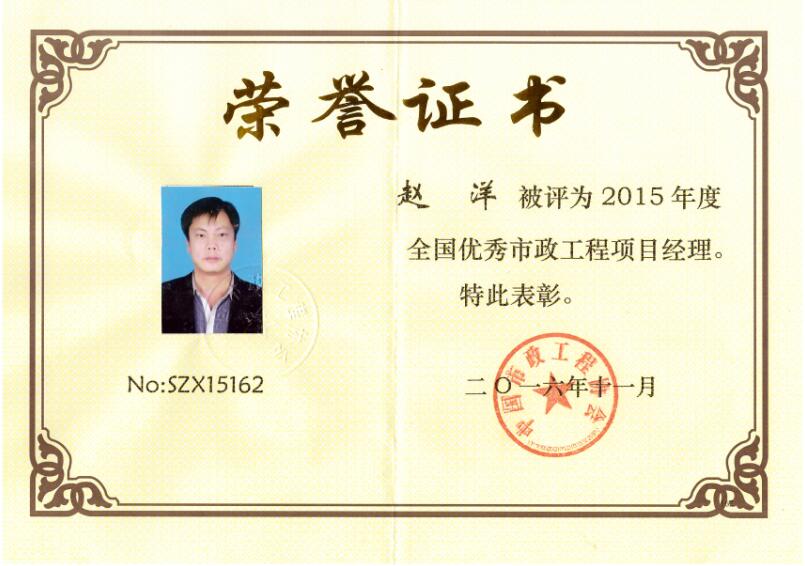 昨日,安徽省市政工程協(xié)會九屆三次理事會議在廬江召開,我公司趙洋同志榮獲“2015年度全國優(yōu)秀市政工程項目經(jīng)理”稱號,全省僅有十二位同志獲得此項殊榮。會上,省協(xié)會主要領(lǐng)導(dǎo)對獲獎?wù)哳C發(fā)了榮譽證書。