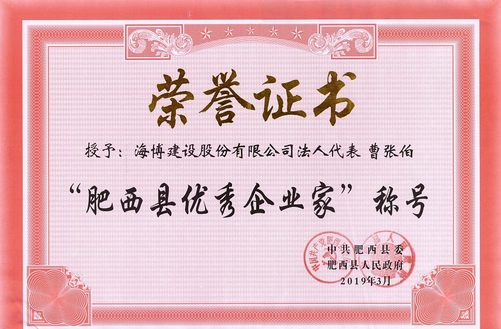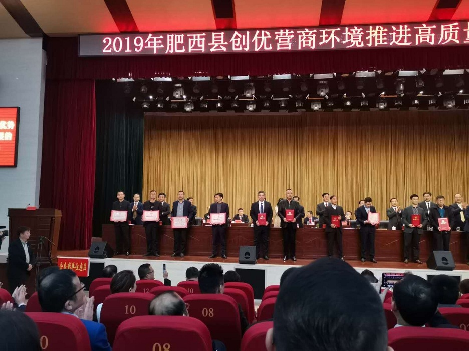 2019年3月30上午9:00整,肥西縣創(chuàng)優(yōu)營商環(huán)境推進(jìn)高質(zhì)量發(fā)展大會在縣政府派河劇場隆重召開,并舉行了“肥西縣優(yōu)秀企業(yè)”、“優(yōu)秀企業(yè)家”頒獎典禮。集團(tuán)公司董事長曹張伯先生獲“肥西縣優(yōu)秀企業(yè)家”榮譽(yù)稱號。
